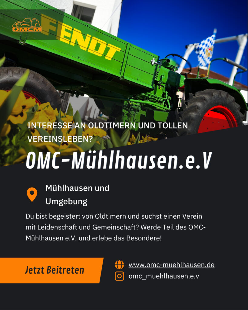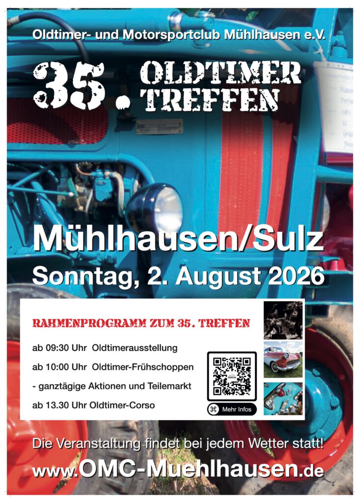 Der OMC Mühlhausen lädt alle Oldtimerfreunde herzlich zum 35. Oldtimertreffen am Sonntag, den 2. August 2026, nach 92360 Mühlhausen/Sulz ein. Seit vielen Jahren ist dieses Treffen ein fester Bestandteil des Kirchweihsonntags und hat sich zu einem beliebten Treffpunkt für Liebhaber historischer Fahrzeuge entwickelt.